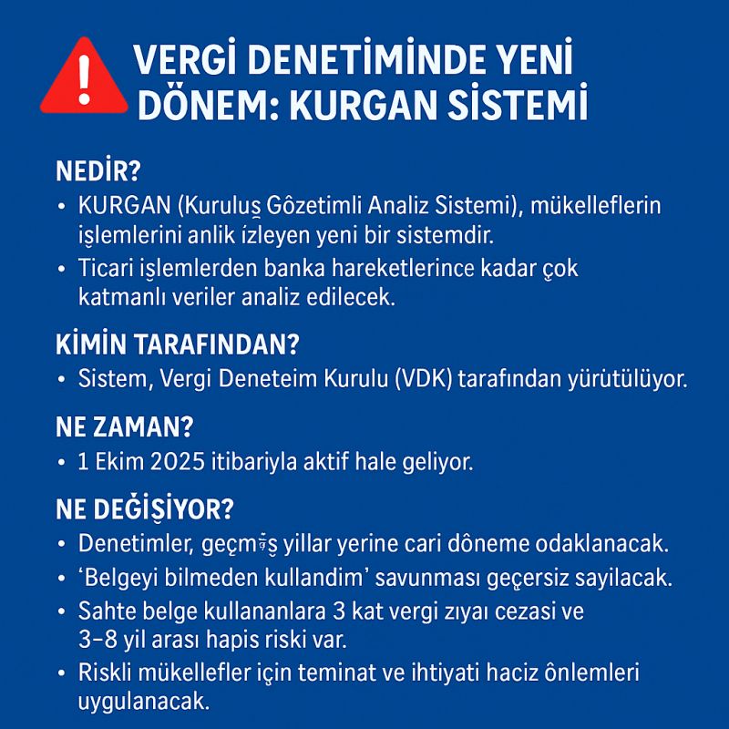 Vergi Denetim Kurulu’nun geliştirdiği KURGAN (Kuruluş Gözetimli Analiz Sistemi), 1 Ekim 2025 itibarıyla devreye giriyor. Bu sistem, yapay zekâ destekli risk analizleriyle ticari işlemleri anlık takip edecek ve sahte belge kullanımını tespit edecek.